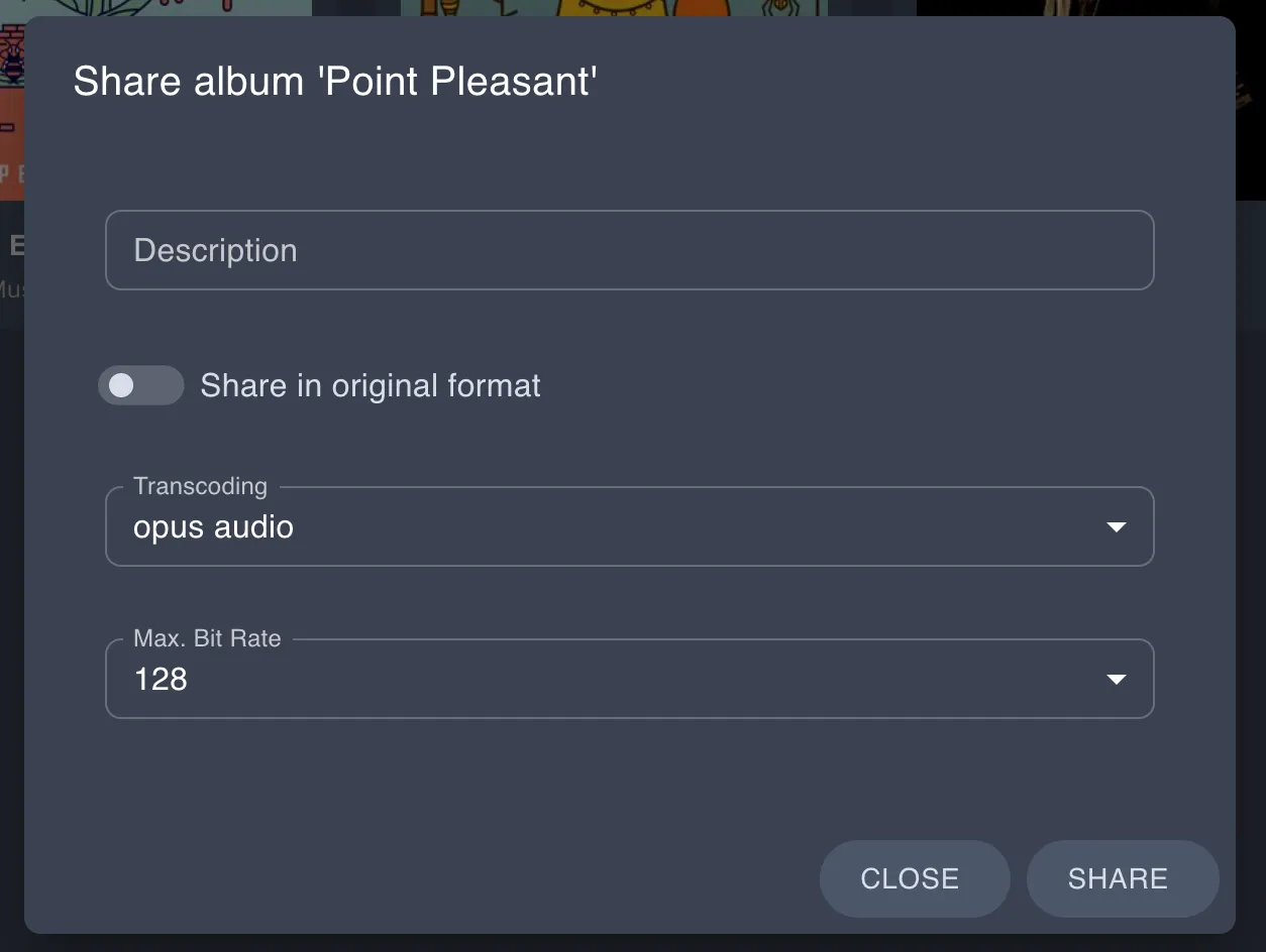 The Sharing feature also implements the related Subsonic API endpoints. See the API docs for implemented endpoints