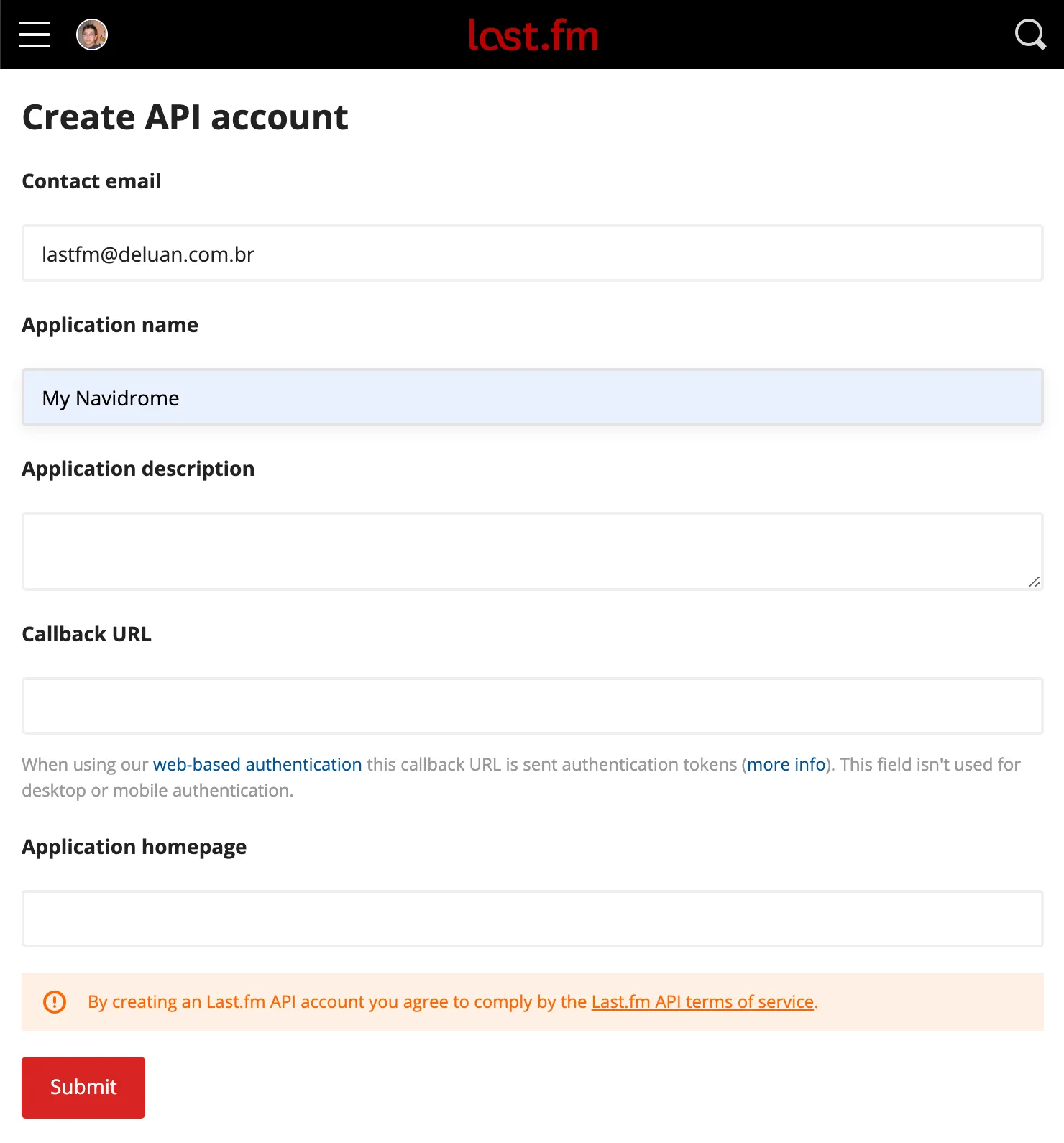 - Go to https://www.last.fm/api/account/create and create an API account. Only the Application Name field is mandatory: